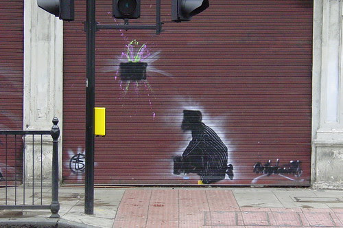 Around the corner in Whitecross Street, Banksy’s Ratapult was thankfully intact but the small oil painted vegetable that appeared nearby a while back had developed a stalk and budding flowers, added by the original unknown artist. A bit of communication on flickr revealed that the plant has grown in stages and who says it has stopped growing?