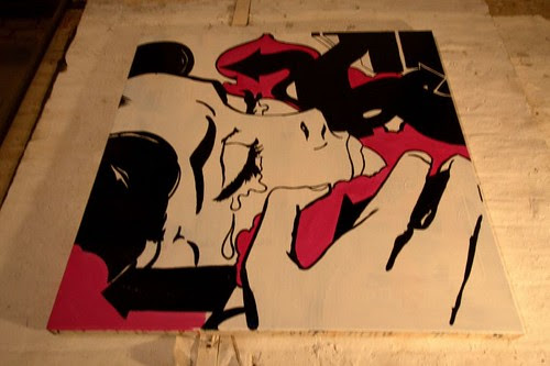 A particular theme is an illustratorly concentration on karma sutra imagery, present in a tryptich of digital prints as well as a series of paste-ups papering the stairway to the upper floor where Cept’s pop art comic aesthetic is displayed. Such images might be found in HowAboutNo's flickr. The perve.