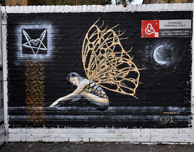 Last week Schade did a new piece on the outside wall at cargo. The fragmented lattice style is there again in the angel/butterfly girl’s wings and the colour scheme the gorgeous contrast effect seen previously on the Old Street and Truman Brewery pieces. The seated figure symbol is there again but there is no obvious link between it and the angel/butterfly girl but obviously being a bit surreal you can’t dismiss the possibility there is some symbolic resonance.